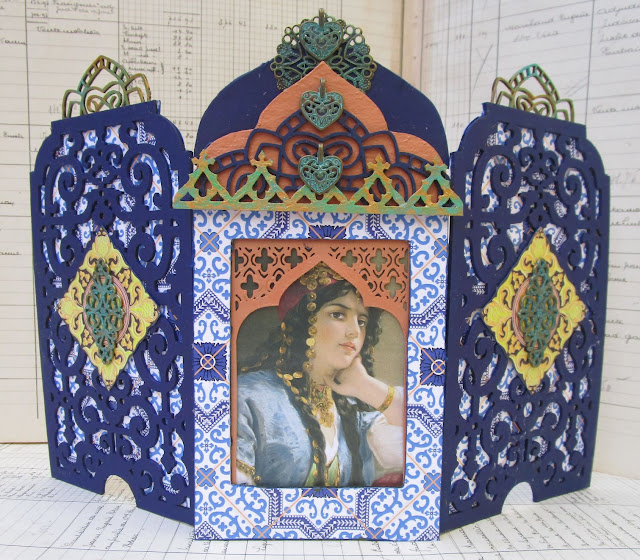 I then added two of the Onion Dome Frame Toppers (comes as a set of three) which I painted with acrylic paints. I also used the included Moroccan Frame (also painted) and this beauty from the Odalisque ATCs Collage Sheet.